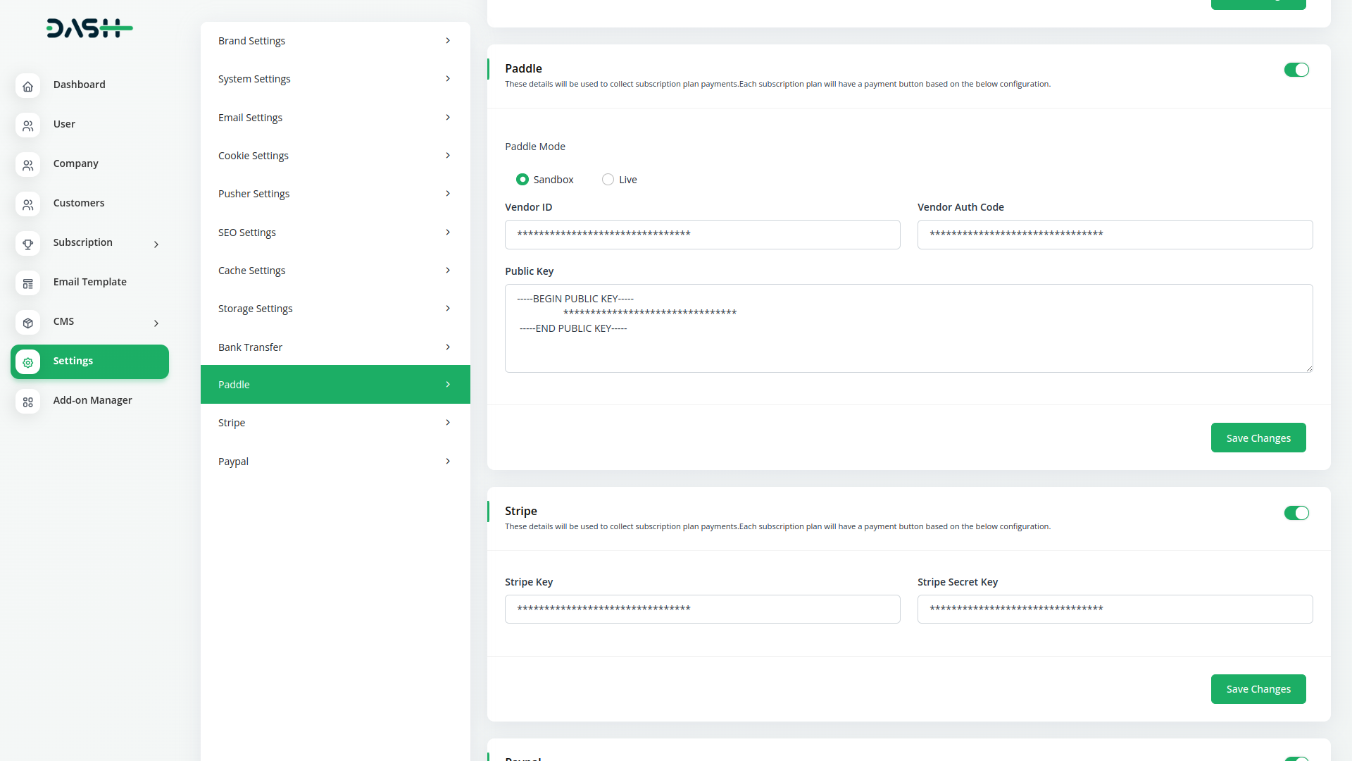 Paddle offers SaaS companies a completely different approach to their payments infrastructure. Instead of assembling and maintaining a complex stack of payments-related apps and services, we’re a merchant of record for our customers, taking away 100% of the pain of payments fragmentation. It’s faster, safer, simpler, and above all, way better.Paddle supports multiple currencies. You can use paddle in Wrkdo-Dash product . First of all you can add your keys in setting page . Make sure your keys are valid.