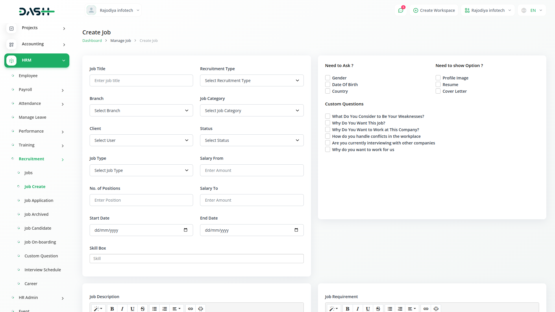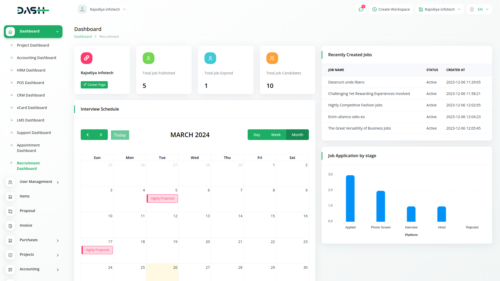 Job Post, Job application, Interview Scheduling, Custom Interview Questions, Job Onboarding, Unique link for applying for a job